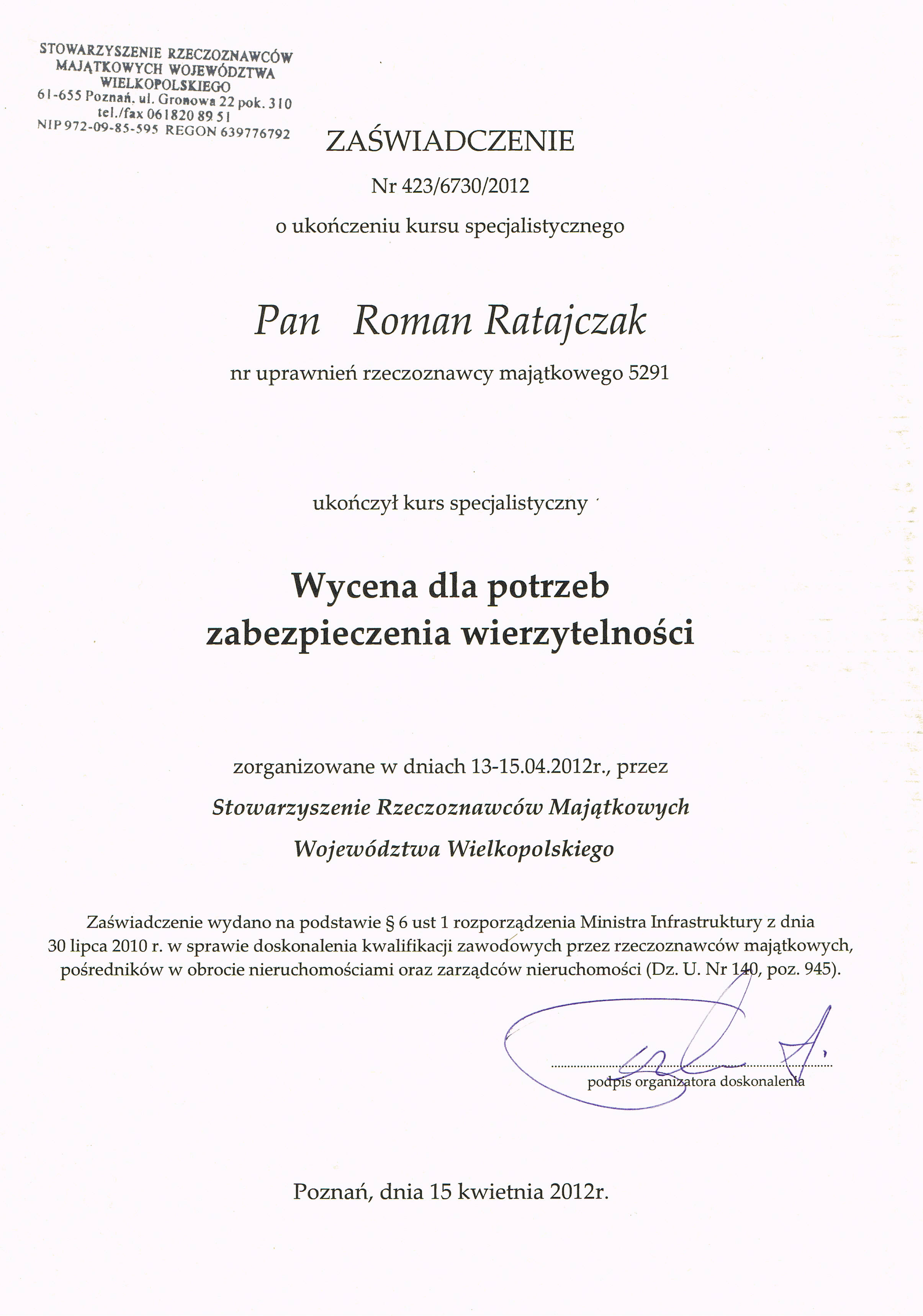 Zaświadczenie o odbytym szkoleniu w zakresie wycen na potrzeby zabezpieczenia wierzytelności